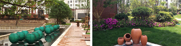 更值得一提的,還有隨處可見(jiàn)的草坪,隨著道路的延伸,草坪時(shí)而在不同的植物組團(tuán)四周鋪展,時(shí)而與一棵棵高大的香樟、無(wú)患子為鄰,間或在小廣場(chǎng)的四周漫生一片綠意。大面積的草坪應(yīng)用,使得小區(qū)就像坐落在一片綠色的地毯中,映著白墻紅瓦的建筑,更顯綠意濃濃。不經(jīng)意見(jiàn),更見(jiàn)幾只高低不一的紅陶瓷罐隨意散落在草坪里,在陽(yáng)光的照耀下,泛出溫潤(rùn)的光澤,一段靜謐的時(shí)光,仿佛就這樣凝固了。