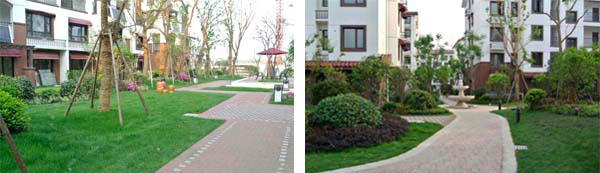 楊經(jīng)理說(shuō):“紫荊東郡的植物配置以統(tǒng)一中富于變化為原則,上層苗木主要選擇大規(guī)格的香樟、無(wú)患子和馬褂木等,中下層則以桂花、雞爪槭、紅葉石楠球、金森女貞球等常見(jiàn)的球類(lèi)灌木及地被苗進(jìn)行組團(tuán),苗木的種類(lèi)雖然不是很豐富,但在配置上卻形式多樣,特別是通過(guò)在施工時(shí)對(duì)設(shè)計(jì)的再深化,要求在植物種植時(shí),樹(shù)形、色彩、線(xiàn)條、質(zhì)地及比例都要有一定的差異和變化,顯示多樣性,但相互之間又有一定的相似性,從而使得整體的植物配置在和諧統(tǒng)一中顯得生動(dòng)活潑,簡(jiǎn)單而不單調(diào),統(tǒng)一而不呆板,營(yíng)造出一種寧?kù)o、閑適的氛圍?!?/p>