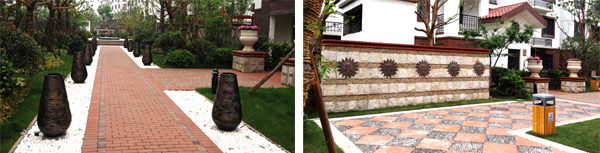 據(jù)楊經(jīng)理介紹,紫金東郡小區(qū)里的鋪裝材料主要以橙紅色的燒結(jié)磚和仿古磚為主,燒結(jié)磚具有承重量大和隔聲性強(qiáng)的特點(diǎn),是小區(qū)園路鋪裝的優(yōu)良選擇,此外,紅色又與建筑的整體色調(diào)相搭配,有種渾然一體的效果感;而仿古磚除了具有防水、防滑、耐磨等特性外,還具有獨(dú)特的古典韻味,更能營(yíng)造出歲月的滄桑和厚重感。在鋪裝方式上,有的是道路中間用橙紅色的燒結(jié)磚,兩邊鋪設(shè)白色的石子,營(yíng)造一種居家庭院的溫馨感;有的是正方形的仿古磚與黑色的石子,一紅一黑,相映成趣;還有的用白色的仿古磚作道路兩側(cè)的點(diǎn)綴,風(fēng)格自成一體。純美的色彩、流暢的線(xiàn)條、些微的暖調(diào),不同的道路上別具特色的圖案,使人走上去踏實(shí)、安穩(wěn)而又感古樸、雅致,成為不斷蜿蜒的腳下風(fēng)景。