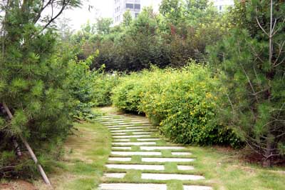 而在道路十字路口的節(jié)點處,則主要是用10cm×10cm的小花崗巖鋪地,鋪出來的路面整潔、平坦,看似簡單,實則對施工技術(shù)要求相當(dāng)高。草坪中的地面鋪裝,則采用花崗巖汀步,用錯縫鋪裝法,兩塊花崗巖之間用草皮鑲嵌,就像給每塊花崗巖鑲了一道綠邊,與旁邊的草坪和諧地融為一體。貫穿整個工程的游憩步道,全部采用“人字形”的鋪裝方法,中間用透水磚、兩邊以花崗巖鑲邊,透水磚價格不高,用以鑲邊的花崗巖是利用了鋪裝中剩余的邊料,雖然用料簡單,但通過對技術(shù)的嚴(yán)格要求,鋪出的路面卻整潔而不失韻味,是一種實用、環(huán)保、節(jié)約的做法。