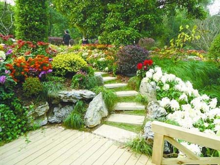 這片鋪滿(mǎn)白色石子的空地,有日本枯山水庭院的感覺(jué),更重要的是,它是孩子們的最?lèi)?ài),一個(gè)個(gè)活潑可愛(ài)的孩子走到這里時(shí)總要盡情地蹦上幾下,或者蹲下去把玩小石子,開(kāi)心的笑容,讓留戀花間的蝴蝶也黯然失色??蓯?ài)的孩子、潔白的石子、紅色的景墻、燦爛的花卉,這種溫馨的畫(huà)面唯有在自家的庭院里,才會(huì)這樣的無(wú)拘無(wú)束。