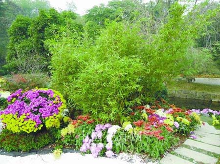 《綠廬》面積只有約400平方米,但植物配置極為豐富,在充分利用原有的桂花、櫻花、羅漢松、竹子等植物的基礎(chǔ)上,又加入了彩葉冬青、厚皮香、銀霜女貞、紅葉扶桑、龜甲冬青、紅花檵木、美人蕉、蘭花三七、沿階草、金邊胡頹子等幾十種植物與菊花相配置,形成了色彩絢麗、層次飽滿(mǎn)、清新雅致的庭院景觀。“這次應(yīng)用的菊花品種有二、三十種,主要有綠牡丹、春日見(jiàn)山、金龍騰云、白萬(wàn)勝、紅切花、紅衣錦繡……顏色有紅、綠、粉、紫、黃等,通過(guò)不同的配植手法,營(yíng)造出五彩斑斕、生機(jī)無(wú)限、高潔清雅的美景,讓人絲毫感覺(jué)不到秋之凋零,反而像是暢游春之繁花勝景?!痹撠?fù)責(zé)人笑著說(shuō)。