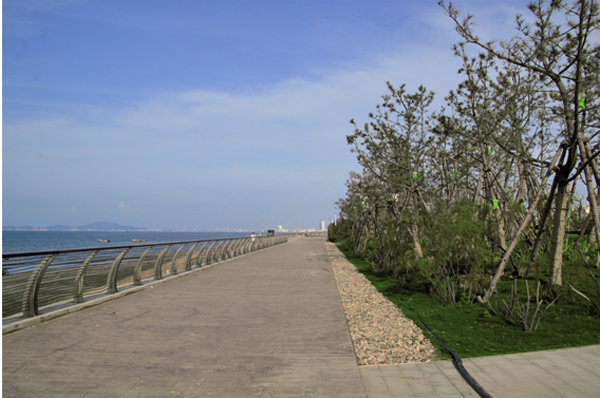 異形種植池采用白色進口涂料抹面,給人強烈的視覺沖擊,與海邊彩膠石搭配,供觀賞及休憩。其中,白色進口涂料與彩膠石是施工中嘗試的兩種新型材料。白色涂料代替了之前的白色水磨石,相比之下其施工工藝簡單,抗海風(fēng)、防鹽堿效果更好;彩膠石代替了之前的花崗巖臺階蓋板,其施工工藝簡單,材料品種和顏色多樣,景觀效果好,與海灘風(fēng)景完美融合。