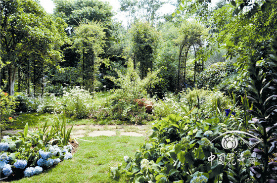 內(nèi)部八仙花花園,以櫸樹、景石、石籠擋墻及園路圍合成半開敞空間,以八仙花為主材,搭配鳶尾、石榴、落新婦、百子蓮等,組成3個(gè)花境組團(tuán),與白色座椅形成半私密的花園景觀。