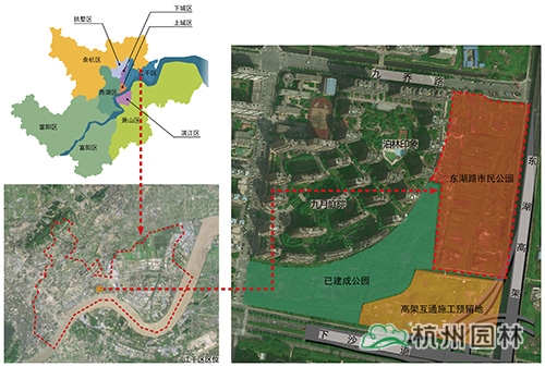 江干區(qū)東湖路市民公園位于東湖路與九喬街西南角,毗鄰九月庭院和泊林印象小區(qū),是江干區(qū)“一帶生態(tài)功能區(qū)”的“運河—錢塘江—東湖路”U型生態(tài)軸的重要節(jié)點。結(jié)合已建成公園和高架互通施工預留地,對東湖路市民公園進行統(tǒng)一規(guī)劃。