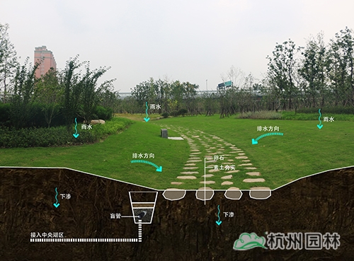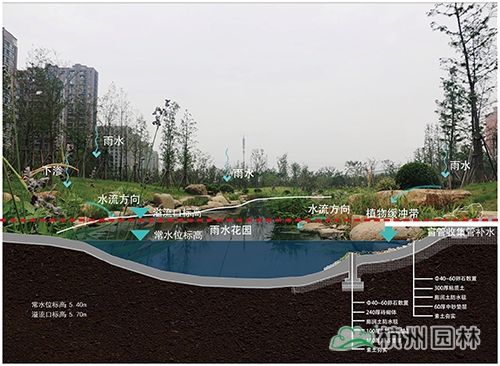 旱溪布置于帶狀綠地低洼處。設計時仿造自然界中干涸的河床,配合濕生植物的營造,在意境上表達出溪水的景觀。降雨時可減緩地表徑流,起到緩排作用。旱溪底部接盲管,將水導入中央湖區(qū),進行儲存。