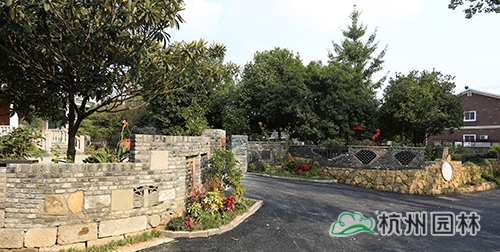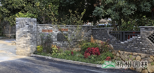 錢三組共有31戶人家,以前,這里家家都是高墻大院,雖然每家的小樓都蓋得很有特色,但卻被高高的院墻擋住了院內(nèi)的風(fēng)光,而且整體綠化景觀單一,缺乏本土特色和文化氣息。如今,高高的圍墻被拆除,改為以舊青磚為主,搭配鋁合金欄桿,以老石板、舊瓦片、老石磨、老石鼓等作為點綴,懷舊物件與現(xiàn)代元素有機結(jié)合,營造出全新的集古樸與時尚于一體的敞開式景墻。在景墻內(nèi)側(cè)種植桂花、意大利絡(luò)石等綠籬,墻外地面種植麥冬等常綠草本植物;在每家庭院入口兩側(cè)和一些節(jié)點處設(shè)置小花境,種植各類常綠、色葉、草花等植物,營造出風(fēng)格多樣的花境景觀,在軟化景墻生硬感的同時,景觀更加豐富多變。