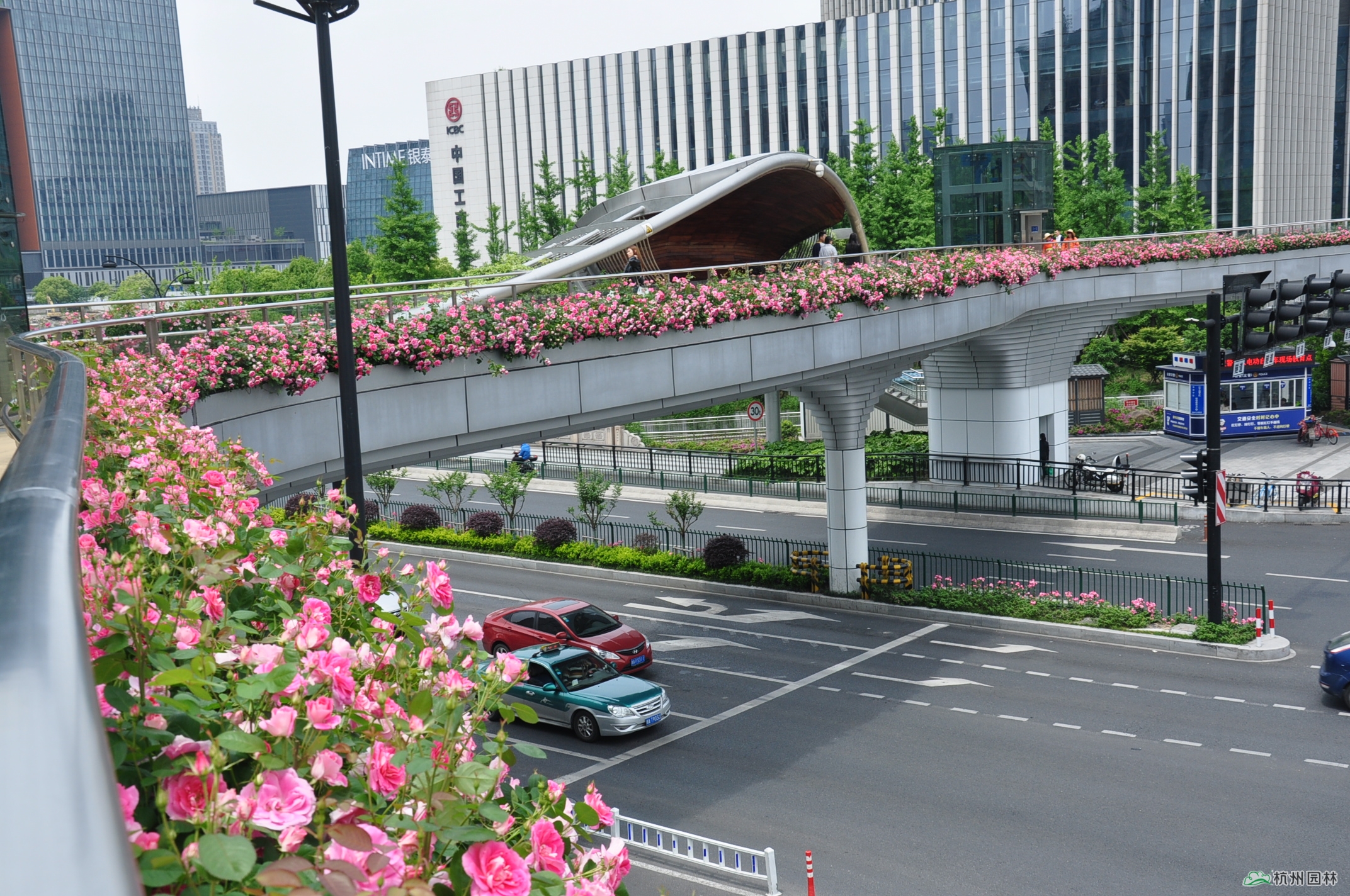 位于新塘路和慶春路交叉口的慶新天橋是新塘路綜合整治工程的標(biāo)志性建筑之一,也是杭州首座仿生態(tài)學(xué)原理的異形人行天橋。橋面獨(dú)特的景觀造型宛如一條風(fēng)景秀美的彩色飄帶,大量月季沿橋面外側(cè)護(hù)欄種植,月季花盛開時節(jié),橋面仿佛戴上了一條色彩絢麗的花環(huán),美不勝收,充分體現(xiàn)了杭州包容、大氣、開放的時代風(fēng)貌、都市氣質(zhì)和國際視野。