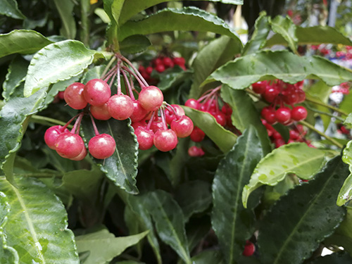 硃砂根的紅果期6個月以上,且株型優(yōu)美,四季常青,紅果艷麗,圓滑晶瑩,與綠葉形成強(qiáng)烈對比,鮮艷奪目,火紅果實(shí)給人以溫馨、熱情的美感,增添了喜慶、富貴的氣氛,觀賞性極強(qiáng),是優(yōu)良的觀果觀葉花卉。