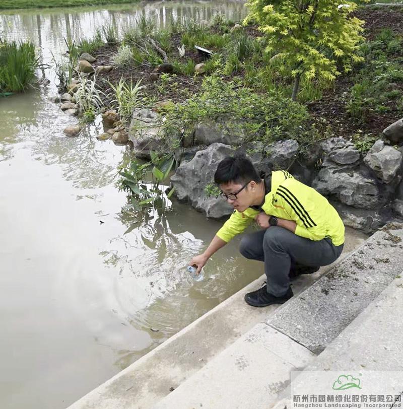研發(fā)中心副主任高凱在浙江園取水樣測(cè)PH