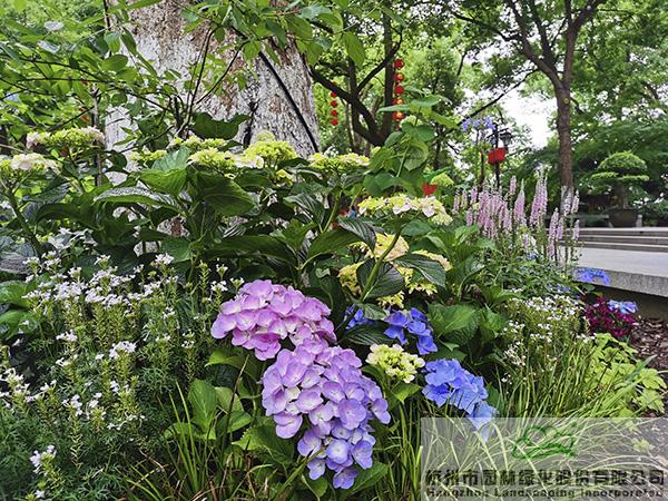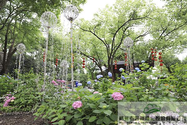 作為本次活動的贊助單位,杭州市園林綠化股份有限公司聯(lián)手繡球花產(chǎn)業(yè)國家創(chuàng)新聯(lián)盟,在城隍閣古樹平臺布置了《花落花開,年華度》為主題的八仙花景觀展示區(qū),“閣樓觀湖二十年,繡球花燈滿堂前”,通過代表浪漫與愛情之美的繡球花境組團,結合錯落有致的景觀挑燈和蜿蜒向前的時間軸序,營造出繁花如繡、前程似錦的美好寓意,以此向城隍閣開放20周年獻禮。
