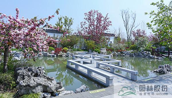 曲折的小橋?qū)@中的水系一分兩半,一邊是平面的水面,一邊是層層跌落的流水,動靜結(jié)合,意蘊(yùn)悠遠(yuǎn),帶給人們更加豐富的景觀體驗(yàn)。而不同的植物配置手法,也讓海棠顯得更加豐姿婥約,優(yōu)美動人。