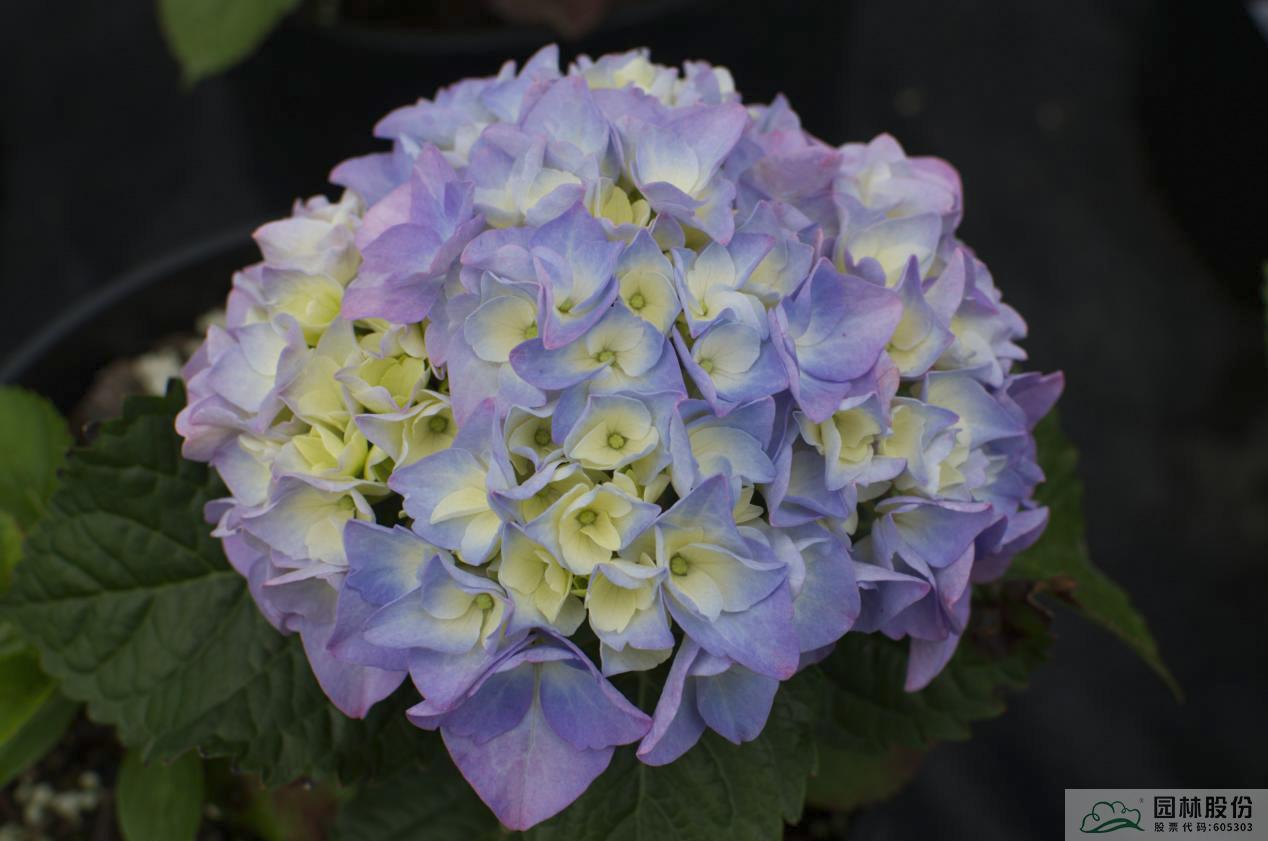 葉片呈卵形,中綠色;扁球狀花,萼片(花瓣)較大,初開時花瓣為亮黃綠色,隨后會慢慢變?yōu)榧t紫、粉藍等。盛花期,其花瓣層層疊疊,絢麗多彩,明媚動人。杭州5月上旬開花,可延續(xù)至6月下旬。