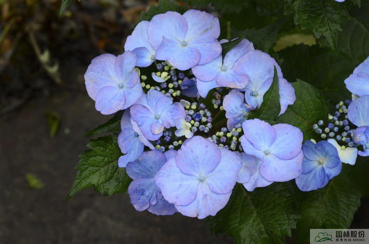 大葉繡球品種間雜交品種;葉片卵形,中綠色;盤狀花,萼片(花瓣)巨大,花色為深紫粉色至鮮紫藍色,添加調(diào)藍劑時可變?yōu)樯钭纤{色。花開時,宛如一只只蝴蝶在枝頭翩躚,靈動多姿。杭州5月上旬開花,可延續(xù)至6月下旬。