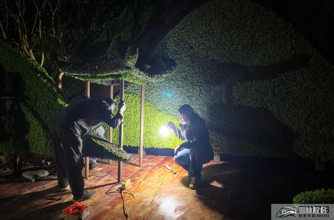 受交通管制等的影響,很多材料只能晚上9:00以后才能進(jìn)場(chǎng)。作為現(xiàn)場(chǎng)負(fù)責(zé)人,江曉鈺提前與植物園管理人員溝通備案,確保運(yùn)輸車輛暢通無阻;安排人員及時(shí)進(jìn)行場(chǎng)地清理,規(guī)劃物料區(qū)、施工作業(yè)區(qū)、車輛暫停區(qū)等,盡快完成卸貨、擺放;對(duì)于需吊裝的部分,精準(zhǔn)安排吊運(yùn)點(diǎn),避免二次搬運(yùn)。根據(jù)菊花展主辦方要求,綠雕整體后移80cm。