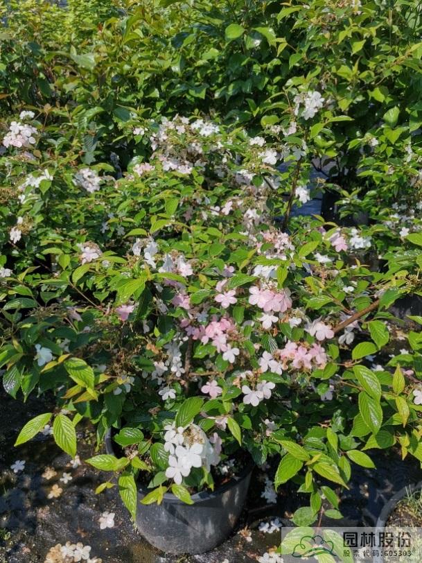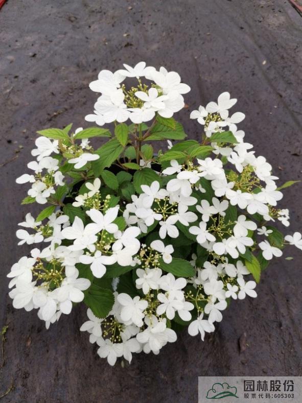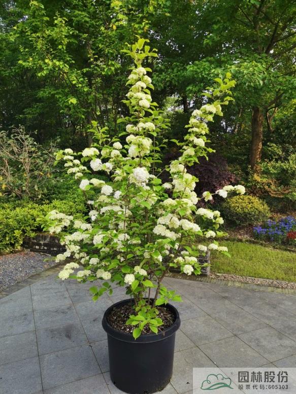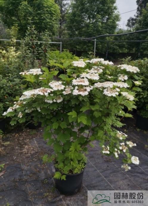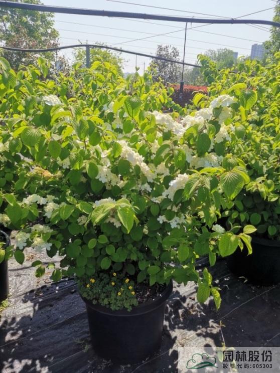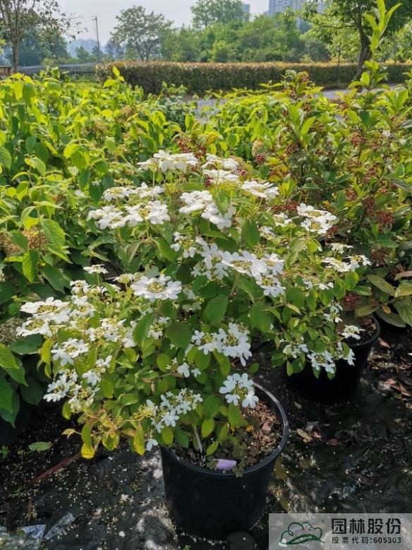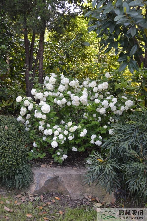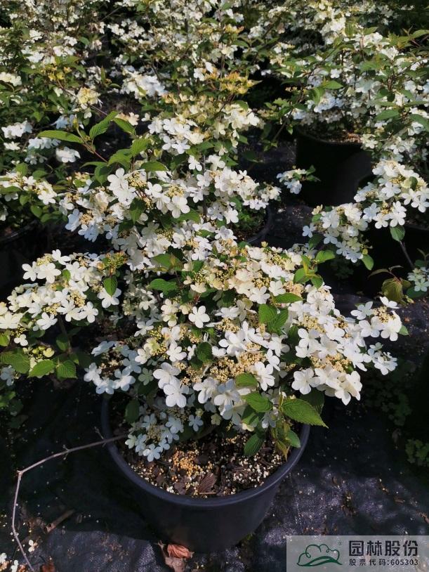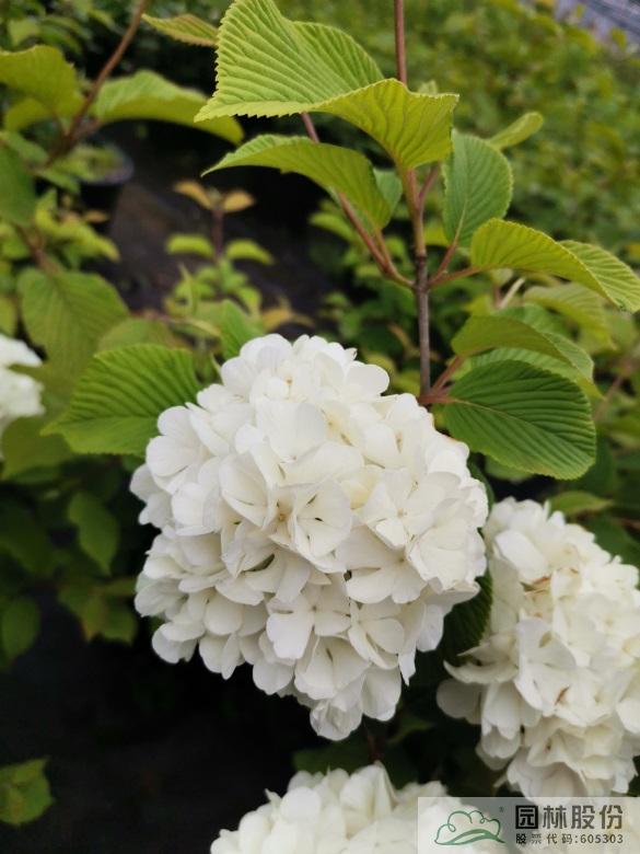 忍冬科莢蒾屬,落葉灌木,樹姿舒展。花序半球形,全為不孕花,開花時(shí)滿樹白花猶如積雪壓枝,高潔素雅,花謝后則綠葉如碧,無論花葉均具有較好的景觀效果。生長強(qiáng)健,喜歡散射光環(huán)境,適合工程應(yīng)用或庭院觀賞。