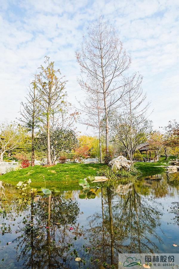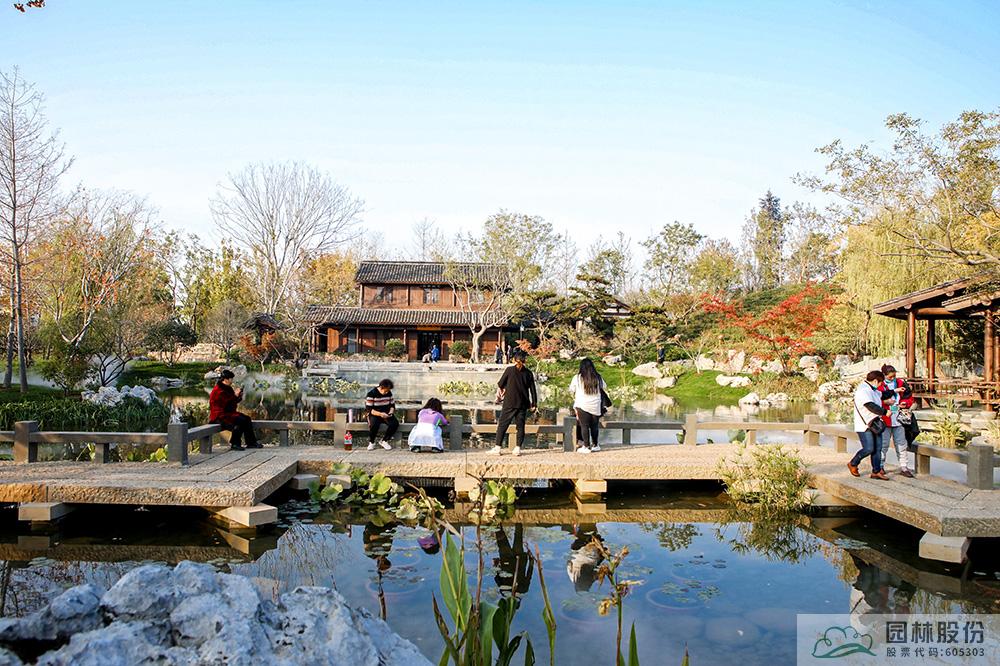 契合展區(qū)主題的樾香亭臨湖而立,雙坡屋面,八柱敞亭,柱子上書五言聯(lián)“魚樂人亦樂,泉清心共清”,盡顯悠閑舒適的情趣。在亭內(nèi)憑欄而坐,側(cè)耳聽風(fēng)雨,迎風(fēng)嗅花香。抬頭遠(yuǎn)望,荷葉亭亭的水面上,有魚兒在水中嬉戲;曲折的長橋上,游人在漫步觀景;水岸邊,銀杏、三角楓、烏桕等色彩繽紛,編織出一幅深秋的美麗畫卷。